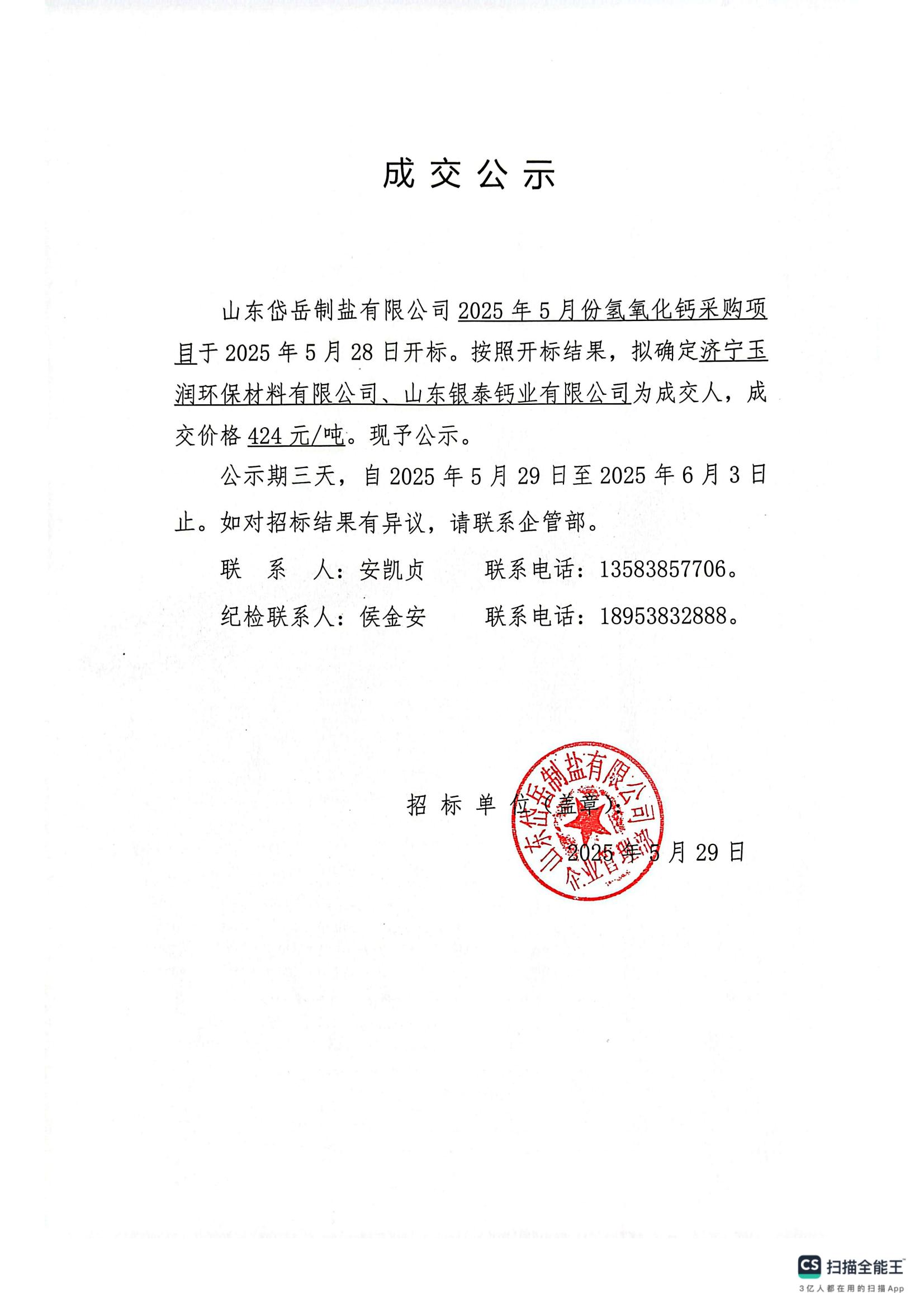 2025年5月份氫氧化鈣采購項目公示