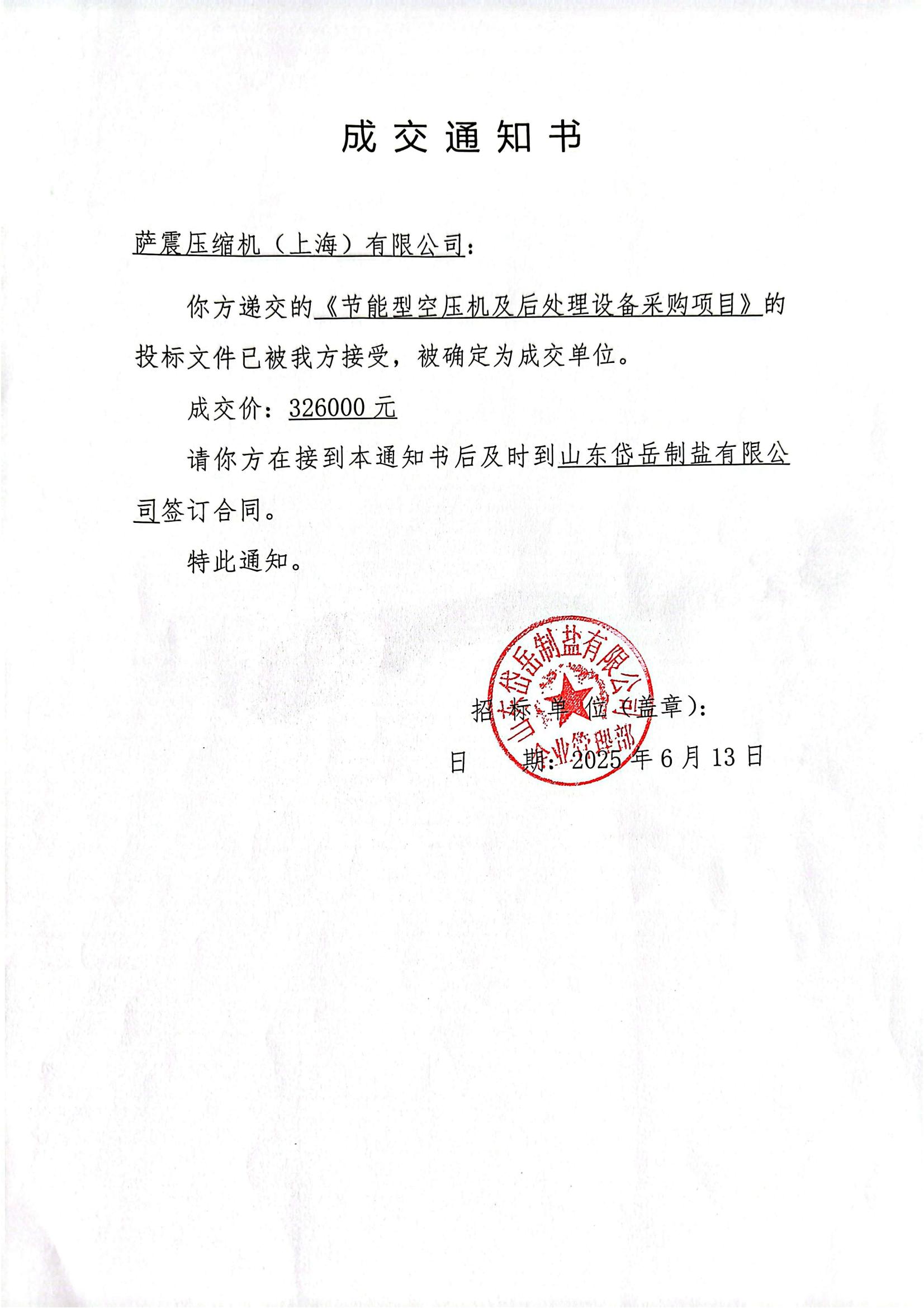 節(jié)能型空壓機(jī)及后處理設(shè)備采購項(xiàng)目成交通知書