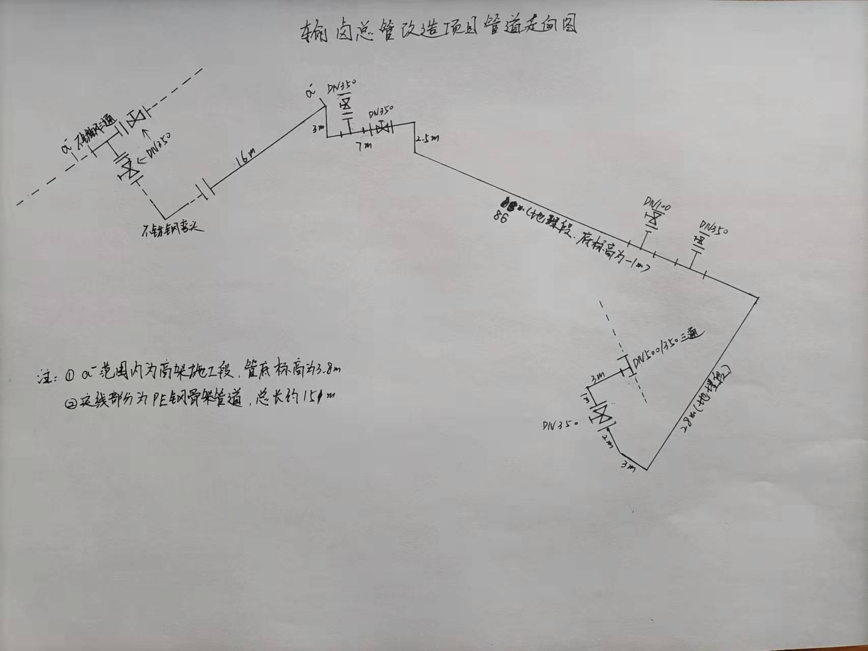 3.1 輸鹵總管改造項目PE鋼骨架管道采購以及安裝施工,施工總長度約151米,具體走向詳見管道走向圖。